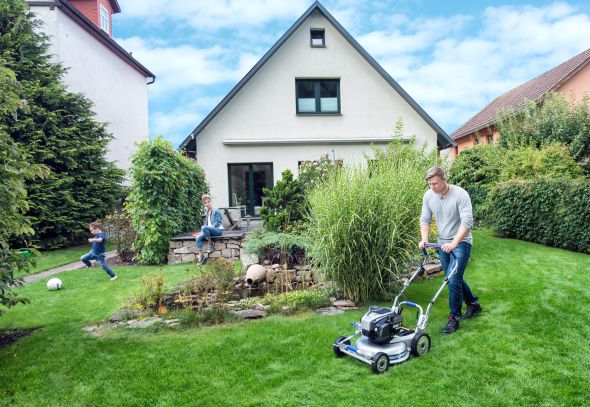 doppelt kugelgelagerte Räder und optionaler Hinterradantrieb und optional leise, abgasfreie Elektromotoren, mit Akku und einem maximalen Gewicht von 38 kg machen auch die Mulchmaster des Heimbereichs besonders bedienerfreundlich.