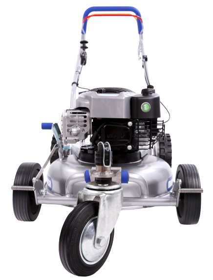 Einfaches Lenken mittels Schwenkrad auf der Vorderachse – ohne Demontage der beiden Vorderräder ermöglicht einfaches Umfahren von Bäumen und Büschen.